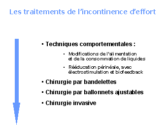- Traitement de l'incontinence d'effort : un traitement conservateur sera prescrit. Puis sera éventuellement envisagée une chirurgie par bandelettes. En cas d'hypotonie sphinctérienne (relâchement des sphincters) avérée, la thérapie par ballonnets ajustables pourra être proposée. En cas d'échec de ces thérapies, d'autres interventions chirurgicales invasives pourront vous être proposées.